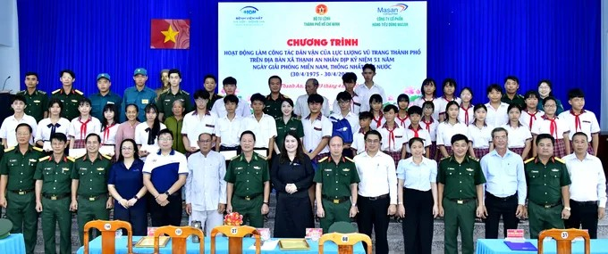 Đại diện BTL TPHCM và người dân, học sinh chụp hình lưu niệm tại chương trình. (Ảnh: SGGP)Sáng 23/4, Bộ Tư lệnh TPHCM tổ chức chương trình dân vận tại xã Thạnh An (TPHCM), nhân kỷ niệm 51 năm Ngày Giải phóng miền Nam, thống nhất đất nước (30/4/1975 – 30/4/2026).